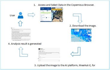 To demonstrate how AI can be used to analyse satellite imagery from the Copernicus Browser, the downloaded satellite image (Figure 1) was uploaded to a self-developed AI-powered chatbot, Meerkat E, for spatial analysis.