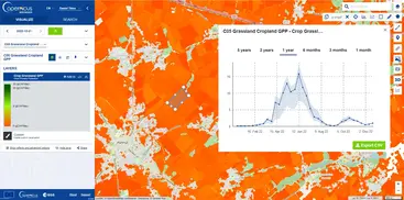 Visualization of the C05 prototype (Grassland Cropland GPP) and analysis of one field (1 year gross primary production) using Copernicus Browser