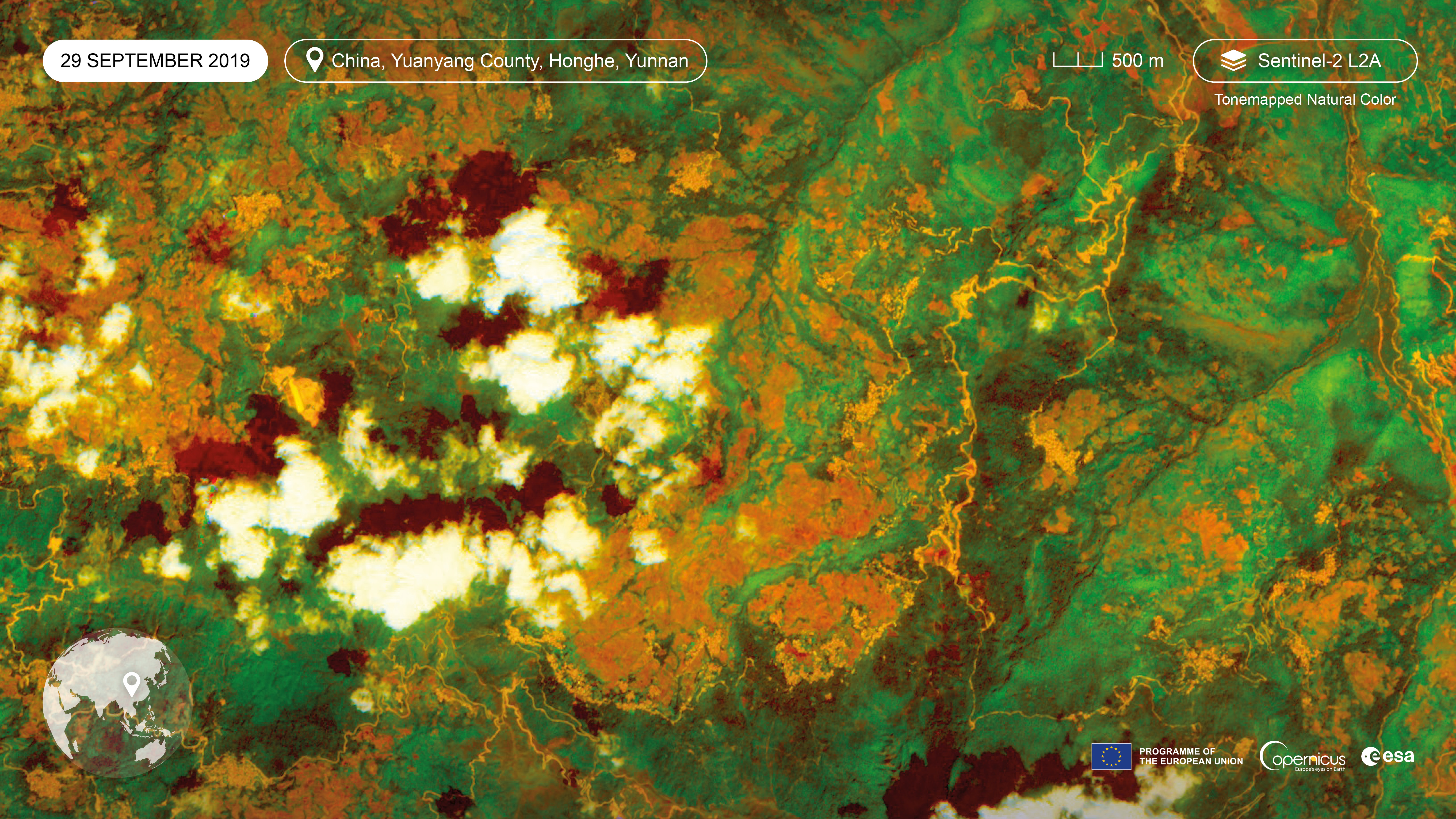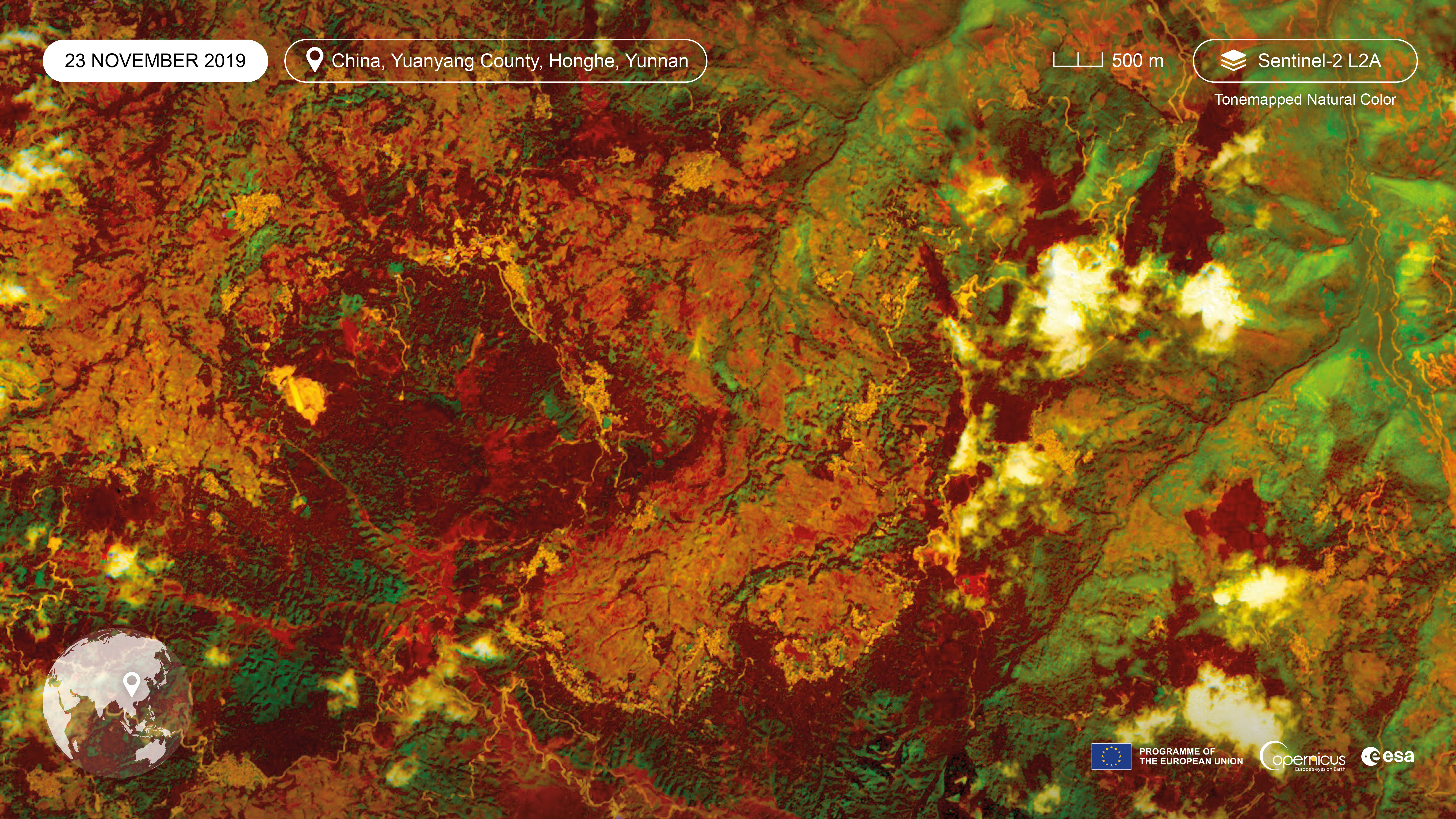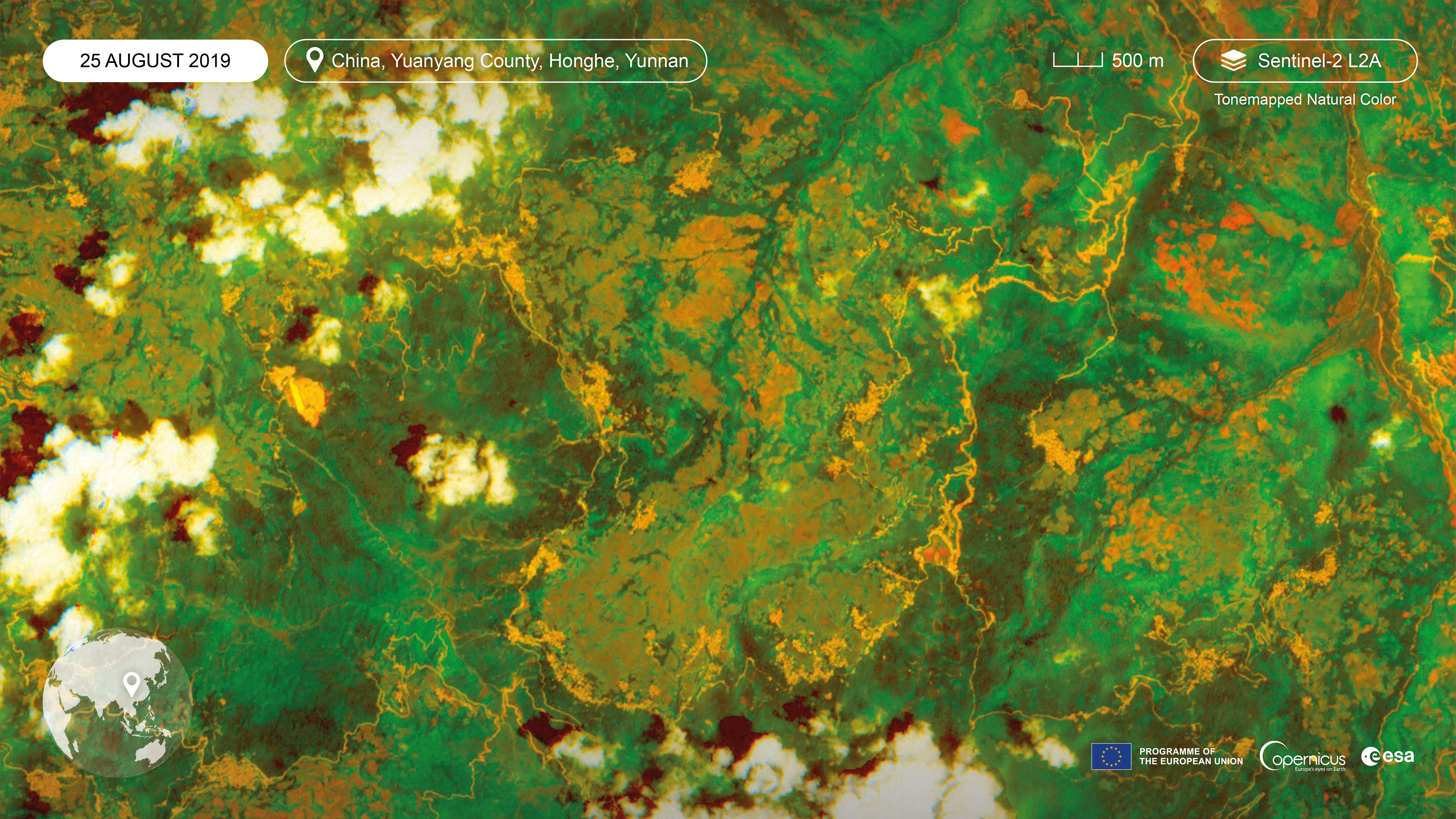 These Sentinel-2 Tonemapped Natural Color scenes from March to November 2019 show Yuanyang Hani Rice Terraces over the growing cycle from planting to harvest. Notice how the rice fields change colours over the growing cycle. You can also see local settlements, visible as groups of white or red patches. The Tonemapped Natural Color Custom Script creates a dramatic effect by preserving luminance while desaturating very bright surfaces such as clouds. A slight adjustment of brightness has been applied.