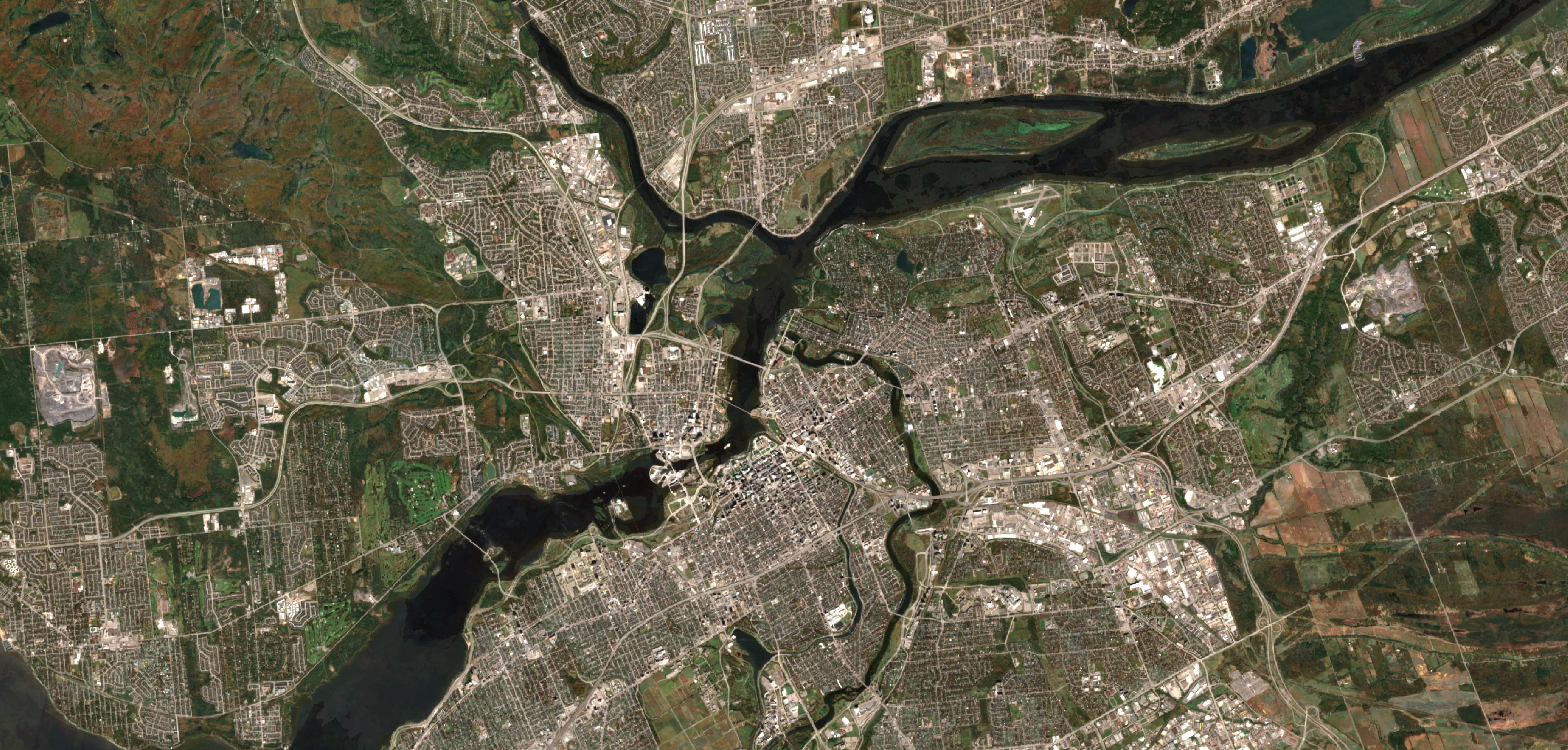 This image is a WorldCover cloudless mosaic of Ottawa, Canada. The ESA WorldCover project released the first global land cover maps at 10 m resolution based on Sentinel-1 and Sentinel-2 data. In order to develop the global land cover map, the team processed Petabytes of data deriving a series of 10 m cloudless global composites. On this image, the Ottawa river flows from west to east through the city, forming spectacular Chaudiére falls (the fan-shaped bright structure near the center of the image), surrounding the Kettle Island nature reserve (the green island in the top right of the image) and several other islands. Parliament Hill is on the south bank downstream of the falls and the largest bridge - the historic buildings can be recognised from their green copper roofs.