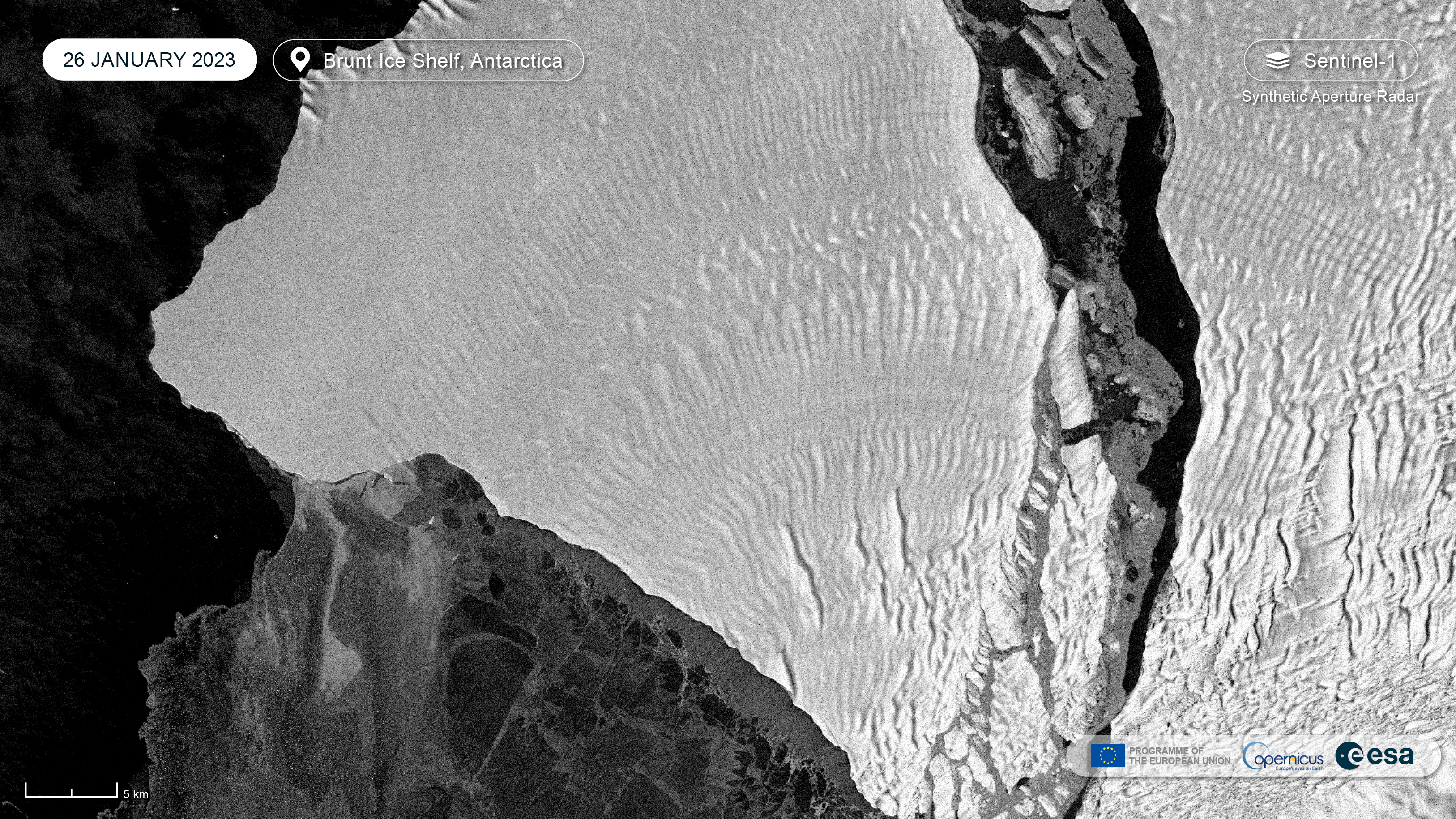 The Sentinel-1 (Synthetic Aperture Radar) image shows the Brunt Ice Shelf on 26 January 2023. Explore the area yourself via the Copernicus Browser.