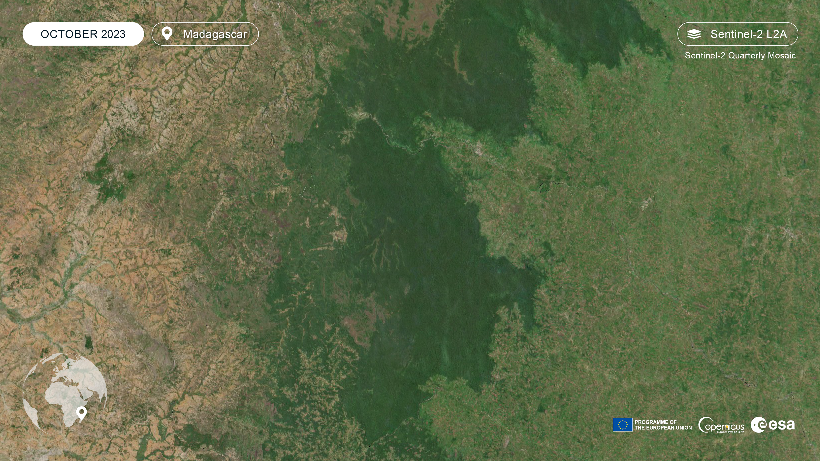 This 3D perspective Sentinel-2 cloudless quarterly mosaic image from October 2023 shows the rain forest area of the national park, surrounded by farmed landscapes. Sentinel-2 plays an important role in forest monitoring for conservation and management globally, but especially in remote areas. Although cloud coverage can be a problem, for these areas, the quarterly cloud-free mosaic provides an undisturbed view, also suitable for quantitative analysis.