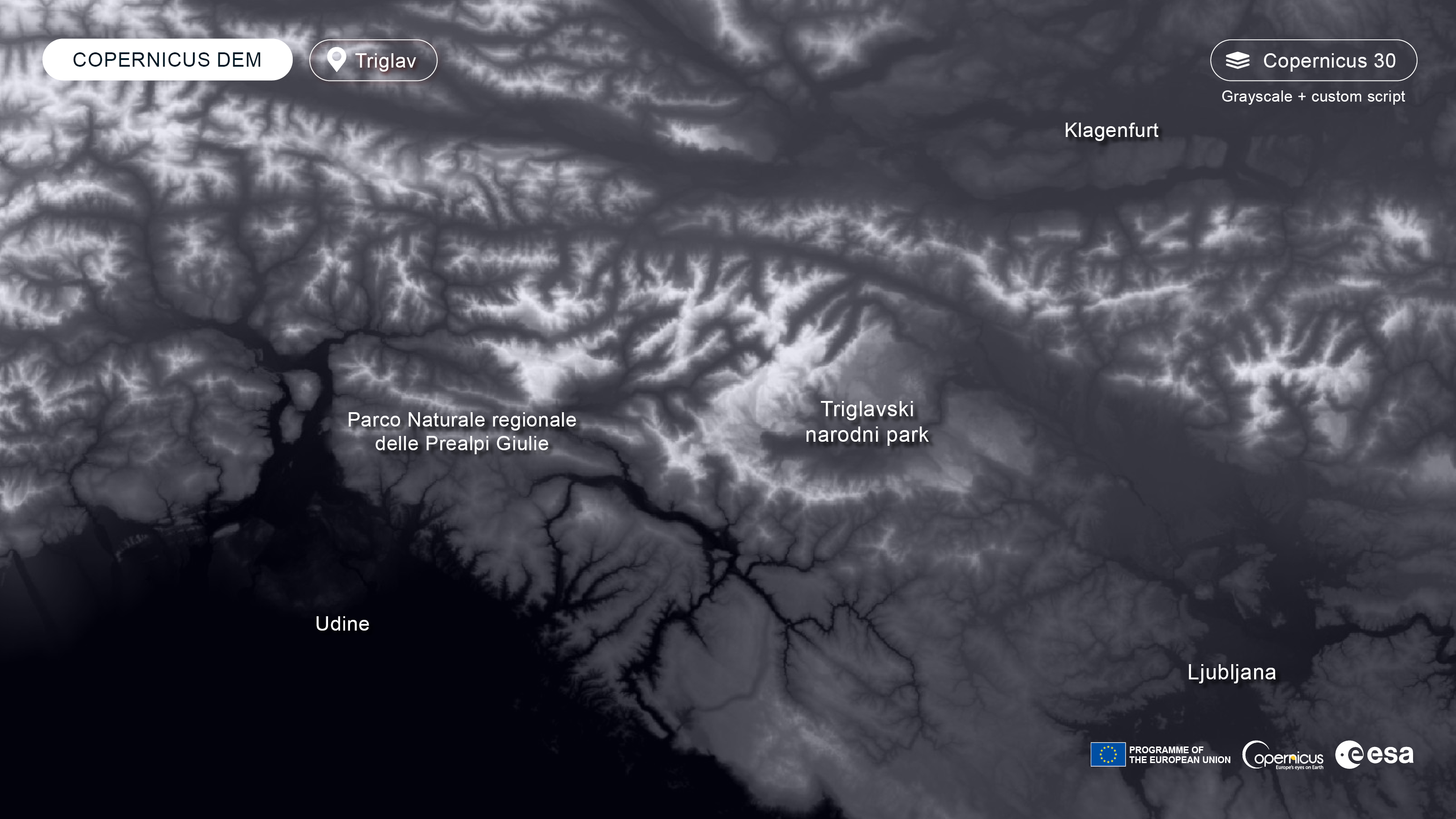 This image shows Triglav in Slovenia derived from the Copernicus Digital Elevation Models which are available in the Copernicus Browser.
