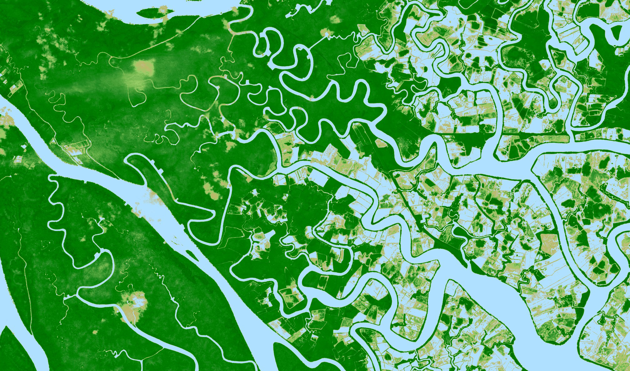 In the Indonesian province East Kalimantan, mangrove forests have been systematically converted into ponds. In 1990, the mangroves covered an area of 268,147 Ha. By 2000, this area was already reduced by 15%. And in 2019, it decreased once again by 5%, leaving 215,514 Ha. Thanks to the Sentinel-2 satellite imagery, we can easily identify the dynamics of mangroves and ponds from year to year.