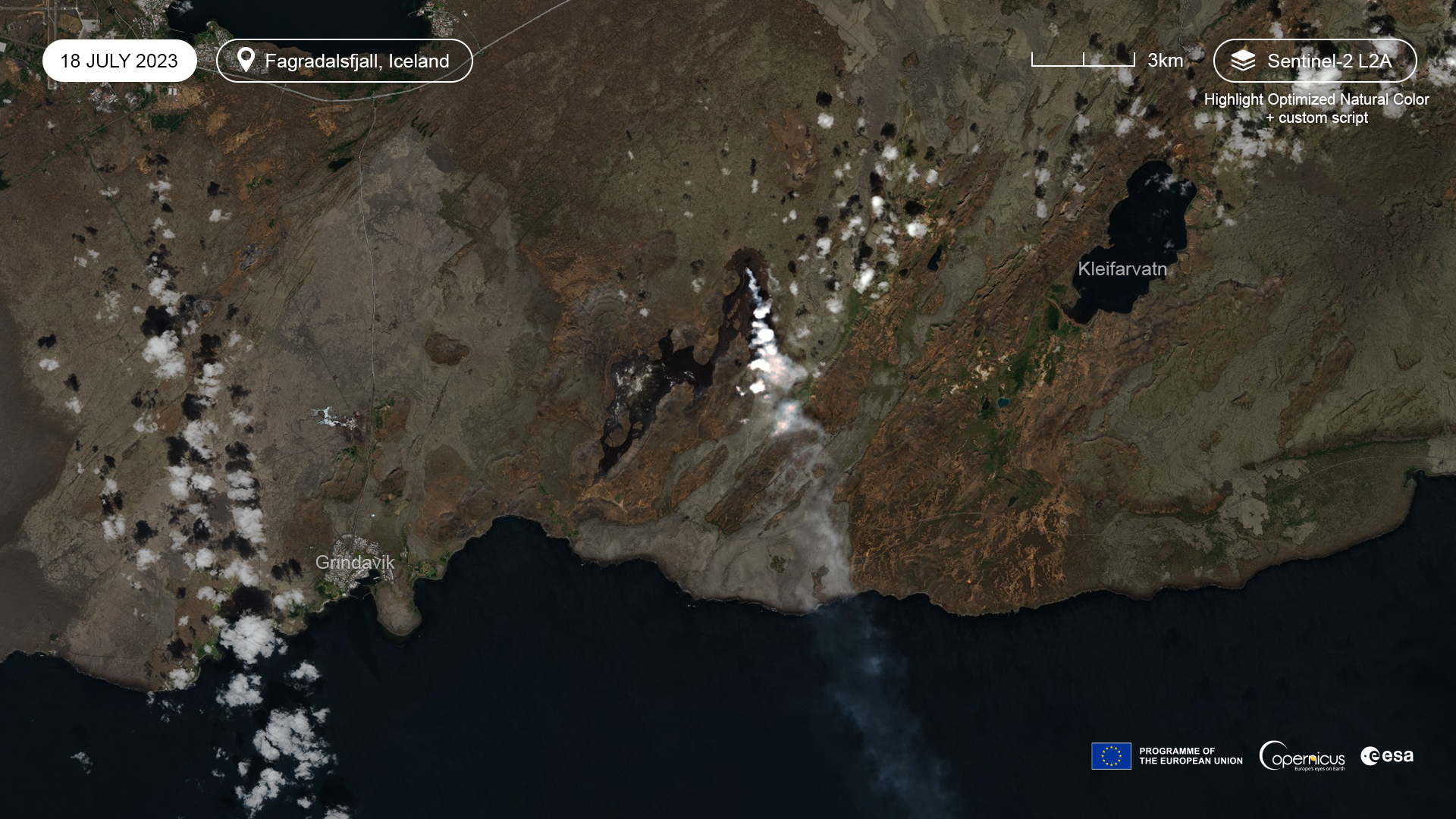 These Sentinel-2 satellite images show the area in Highlight Optimized Natural Color on July 8, 2023; July 11, 2023; July 18, 2023. Do you want to witness the forces of nature yourself? Follow up the eruption via the Copernicus Browser.