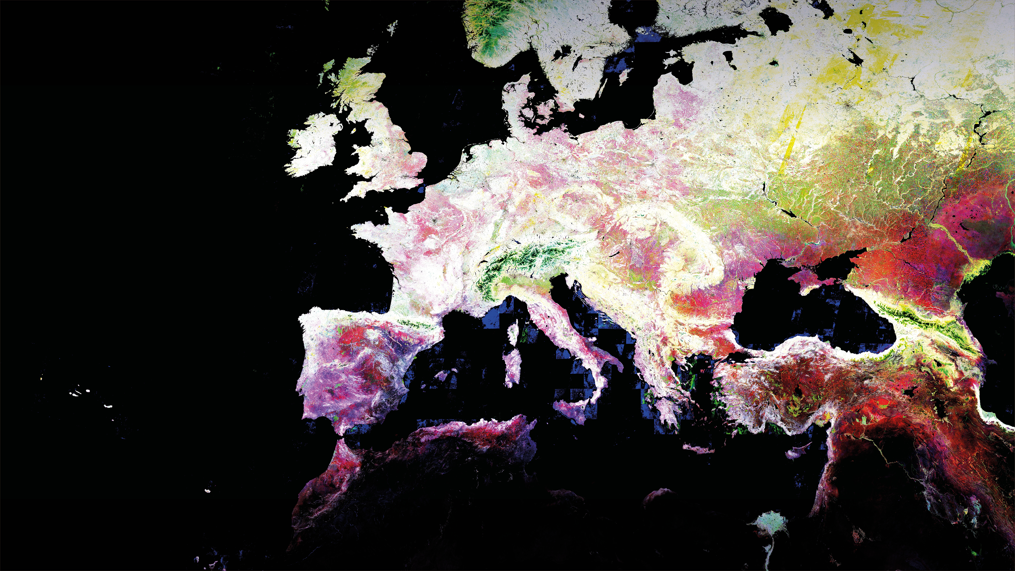 This image is a 3D perspective view of Europe, including parts of North Africa and Asia. This color rendering was created based on Sentinel-2 Level 3 quarterly cloudless mosaics. These seamless images are produced with a standardised method for the full globe. The visualisation is a modified version of the Agricultural Growth Stage Custom Script, which assigns red, green and blue values to each pixel based on the timing and intensity of the NDVI (Normalized Difference Vegetation Index) peak. Pixels with the most vigorous vegetation between April and June are red, areas with the vegetation peak between July and September are green, and pixels with vegetation peaks between October and December are blue. The brighter the colour, the stronger and healthier the vegetation.