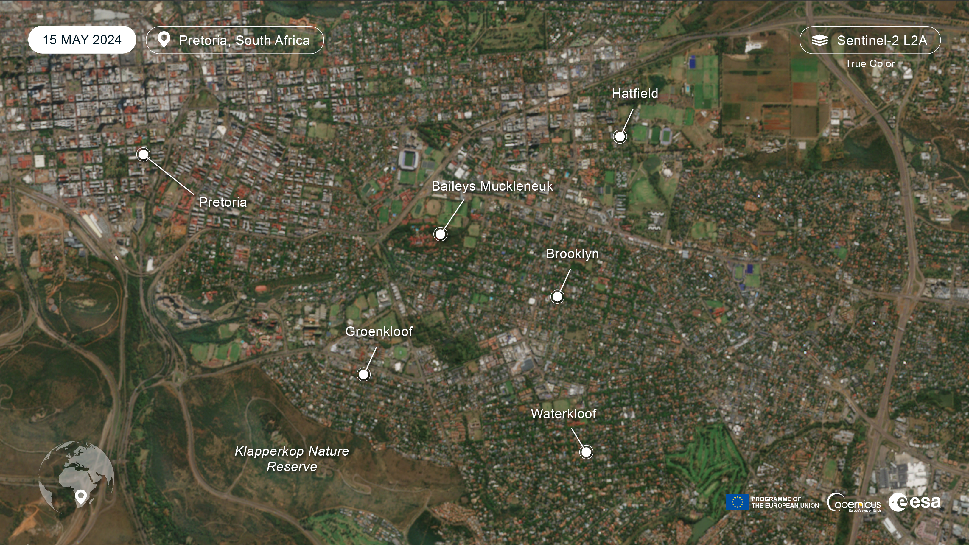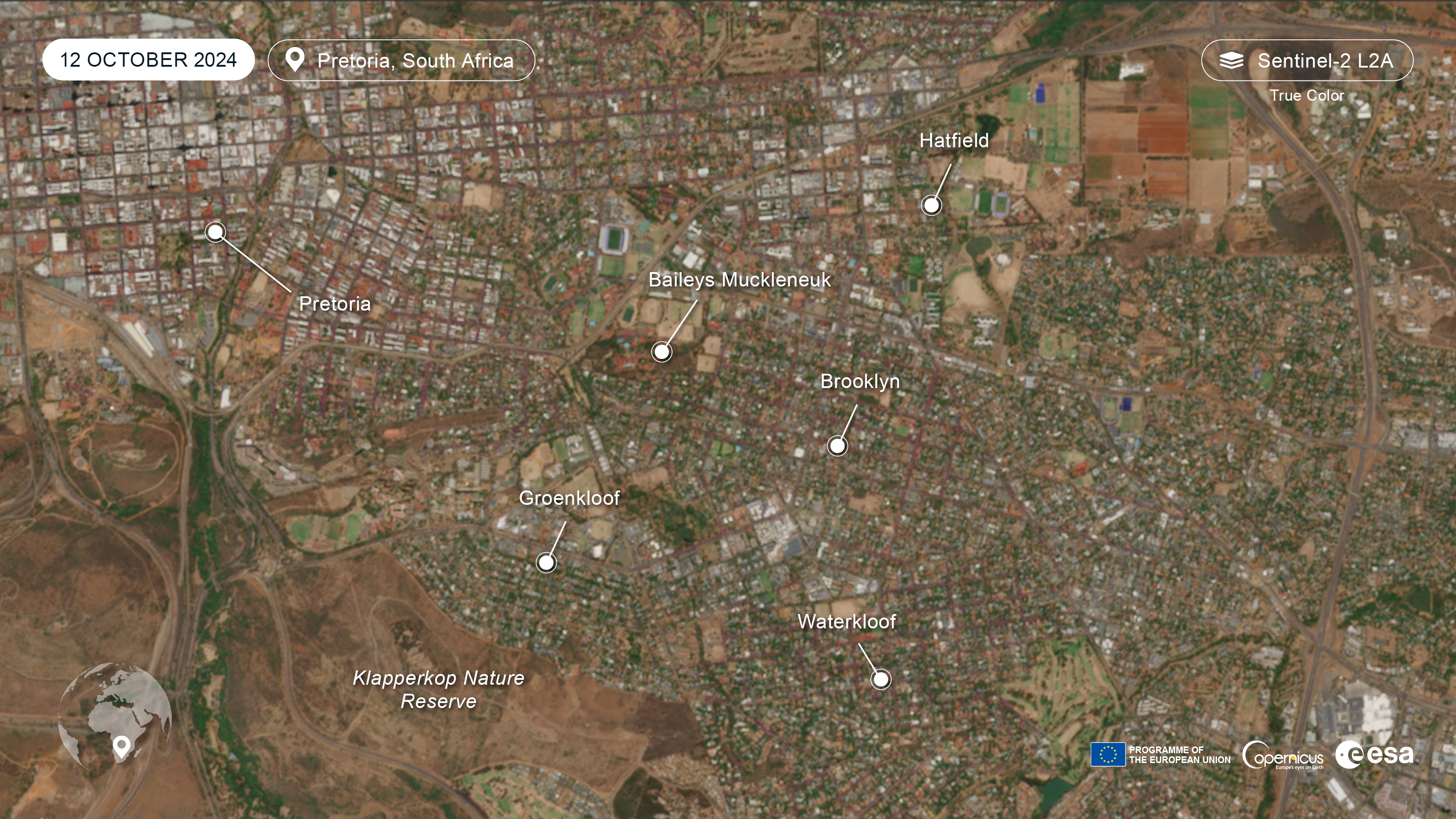 These Sentinel-2 images of 12 October 2024 and 15 May 2024 are slightly contrast enhanced Sentinel-2 True Colour images of the Brooklyn neighbourhood of Pretoria, South Africa showing the difference between the seasons. At the center south of the image, you can see the golf court of the Pretoria Country Club, Loftus Versfeld Stadium is in the northwest corner, with the University of Pretoria across the road. The dry grassland in the southwest corner is part of Klapperkop Nature Reserve. If you try the hide layer/show layer switch in the Browser, you can see what the city looks like in the autumn when the vegetation is greener, but the trees are not in bloom.