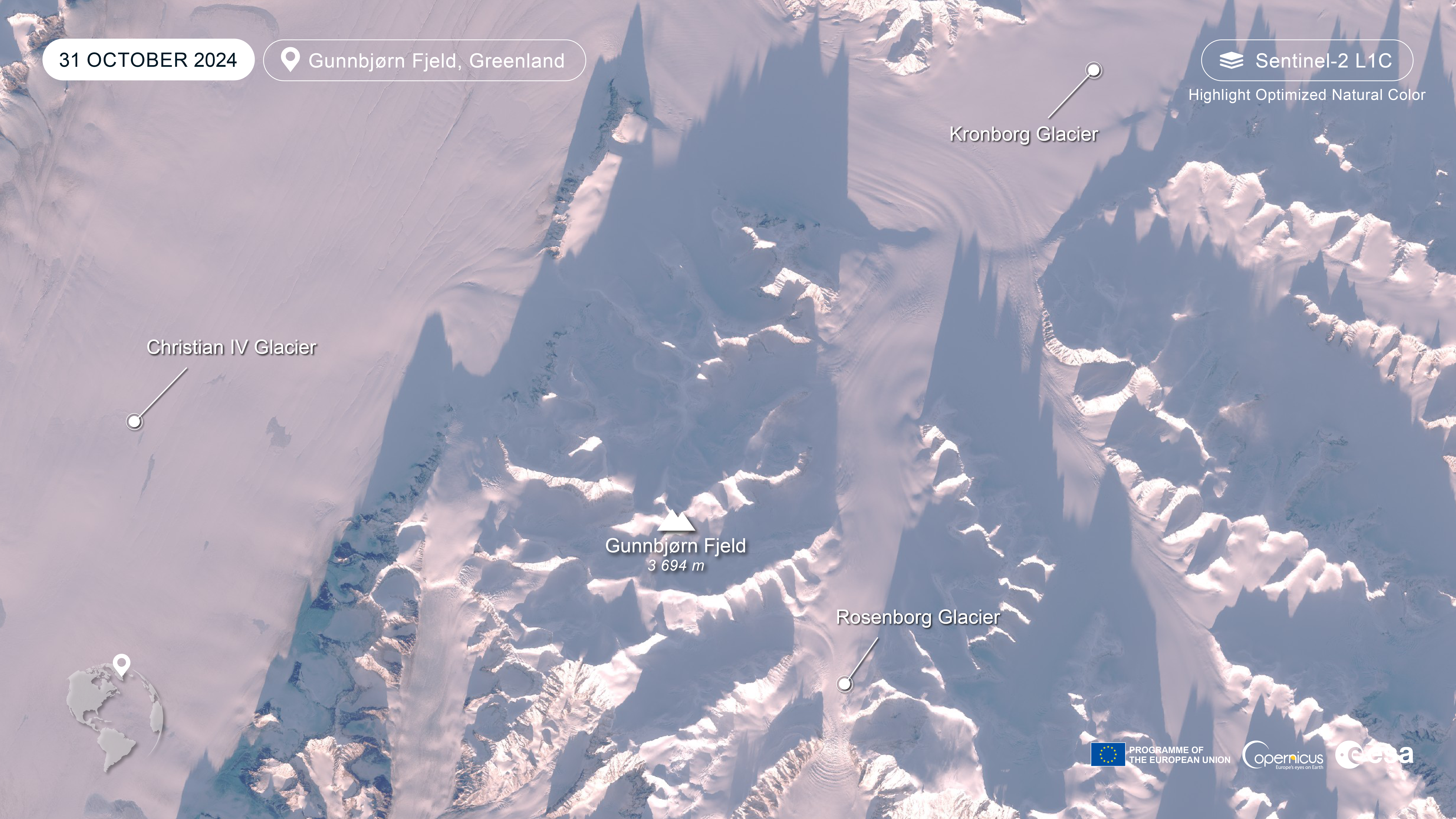 The visualization is a Sentinel-2 Highlight Optimized Natural Color image, which slightly enhances the contrast of very dark and very bright areas for better interpretation. Elevation contours have been added as an overlay. Understanding scale can be challenging without familiar reference points. This image spans approximately 50 km from east to west. Gunnbjørn Fjeld is located in the central-southern part of the image, with Christian IV Glacier to the west, Kronborg Glacier to the north, and the spectacular icefall of Rosenborg Glacier to the south.