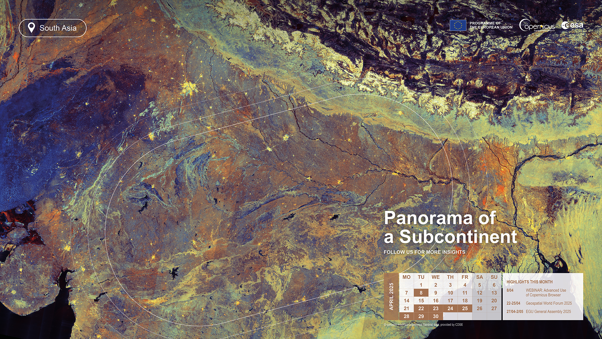 This image is a Sentinel-1 monthly mosaic from December 2024 of Northern India and Nepal, with parts of eastern Pakistan, western Bangladesh, and southern Tibet. The image is about 1400 km from east to west, showing the power of seamless, integrated monthly mosaics.