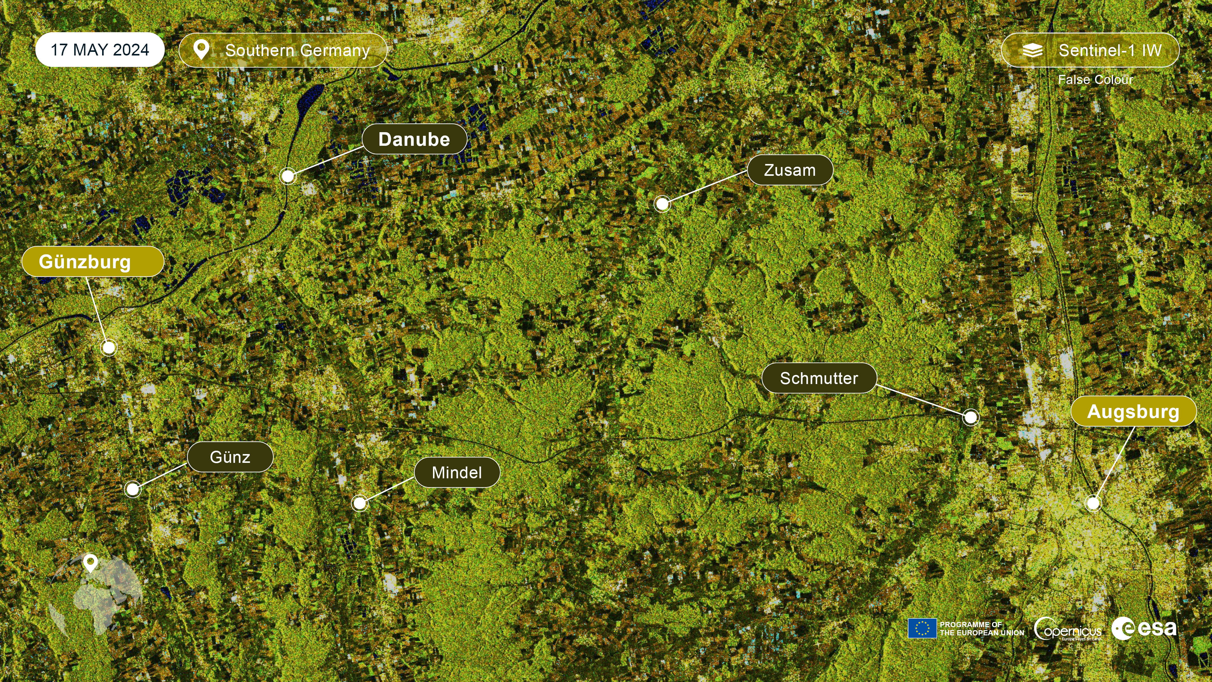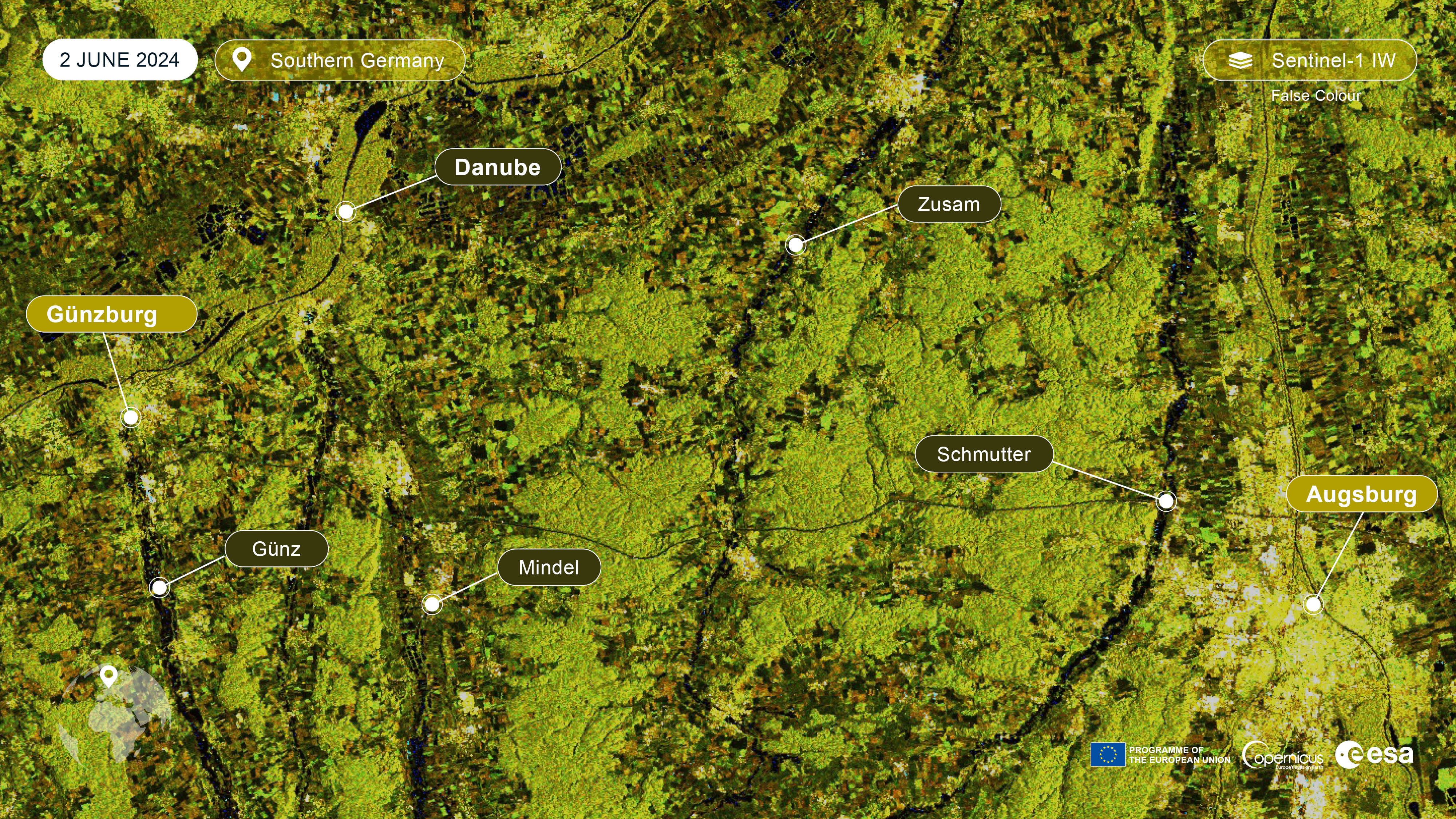 In this scene, you can see the valleys of the Günz, Mindel, Zusam and Schmutter rivers (from W to E respectively) flooding their valleys. Bright areas are settlements, characterized by high reflectivity. Yellow-green areas are densely vegetated, while agricultural land ranges from brown to yellow and green. In some cases, large flat surfaces such as airports can also have the same signature as water surfaces.