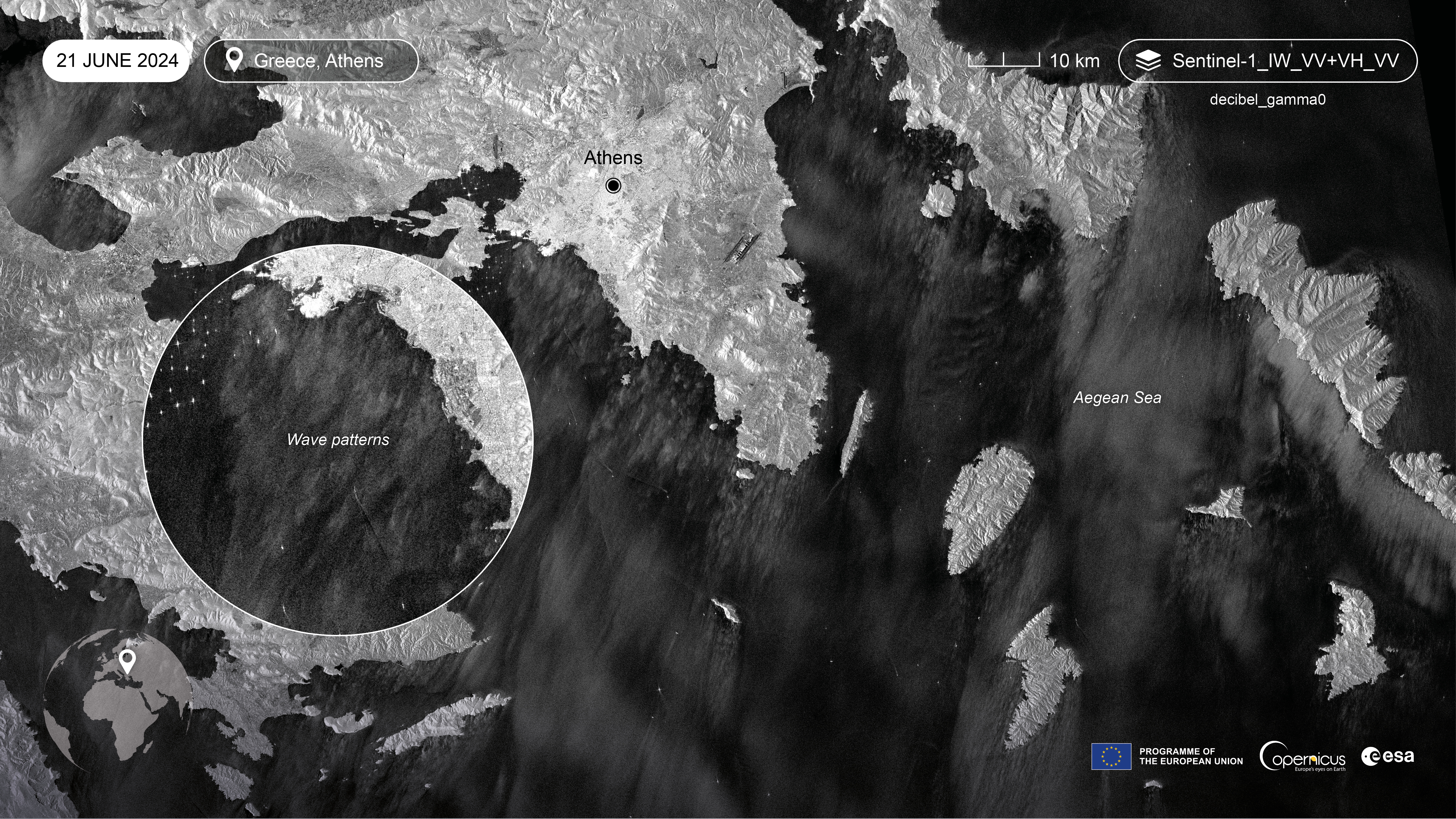 Eager for a preview? Take a look at the satellite image above, taken on 21 June 2024. The radar signal of the Sentinel-1 satellite is reflected both from land and water. The strength of the signal on land is determined by topography, buildings and vegetation - clearly lighting up the city of Athens. The reflectivity on water depends on the wave texture, controlled by the wind. As you can see, it was a windy day on the Aegean Sea, leaving atmospheric wave patterns in the water. Islands and coastal features create turbulence, leaving more rough water downwind (south), often creating long plumes. This way, although we can not measure wind directly with Sentinel-1 imagery, we can estimate wind and wave patterns on the sea.