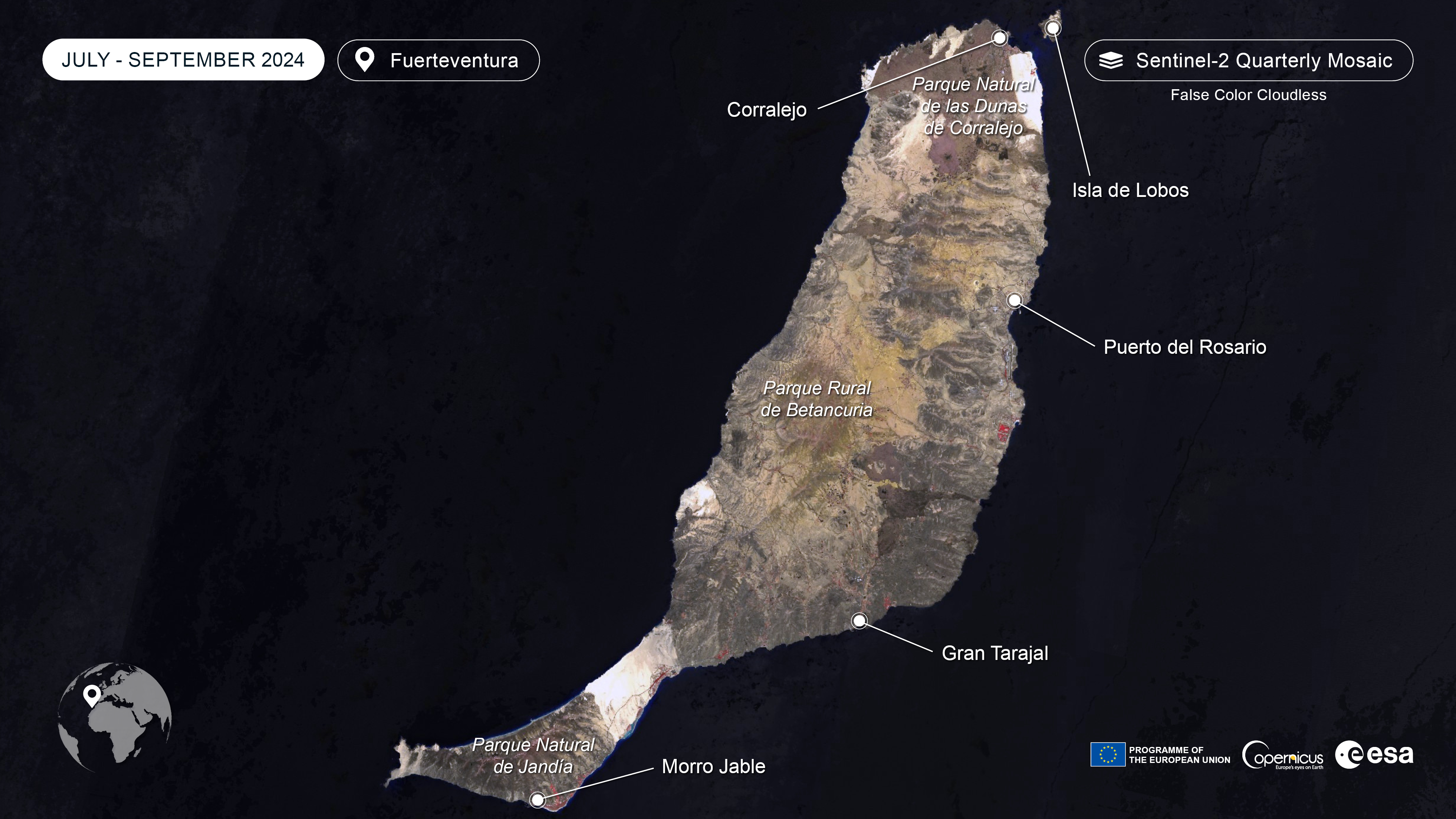 This satellite image is a Sentinel-2 quarterly mosaic, a near-infrared false-color composite with subtle blue enhancements. Typically, near-infrared images appear bright red due to the strong reflectance of vegetation, but on Fuerteventura, the only significant green spaces are — surprise! — golf courses. So, this satellite image of Fuerteventura shows a very broad range of reflective terrain surfaces from white sand dune landscapes to dark grey volcanic rock, all surrounded by the deep, almost black, Atlantic Ocean as water reflects very weakly in near infrared.