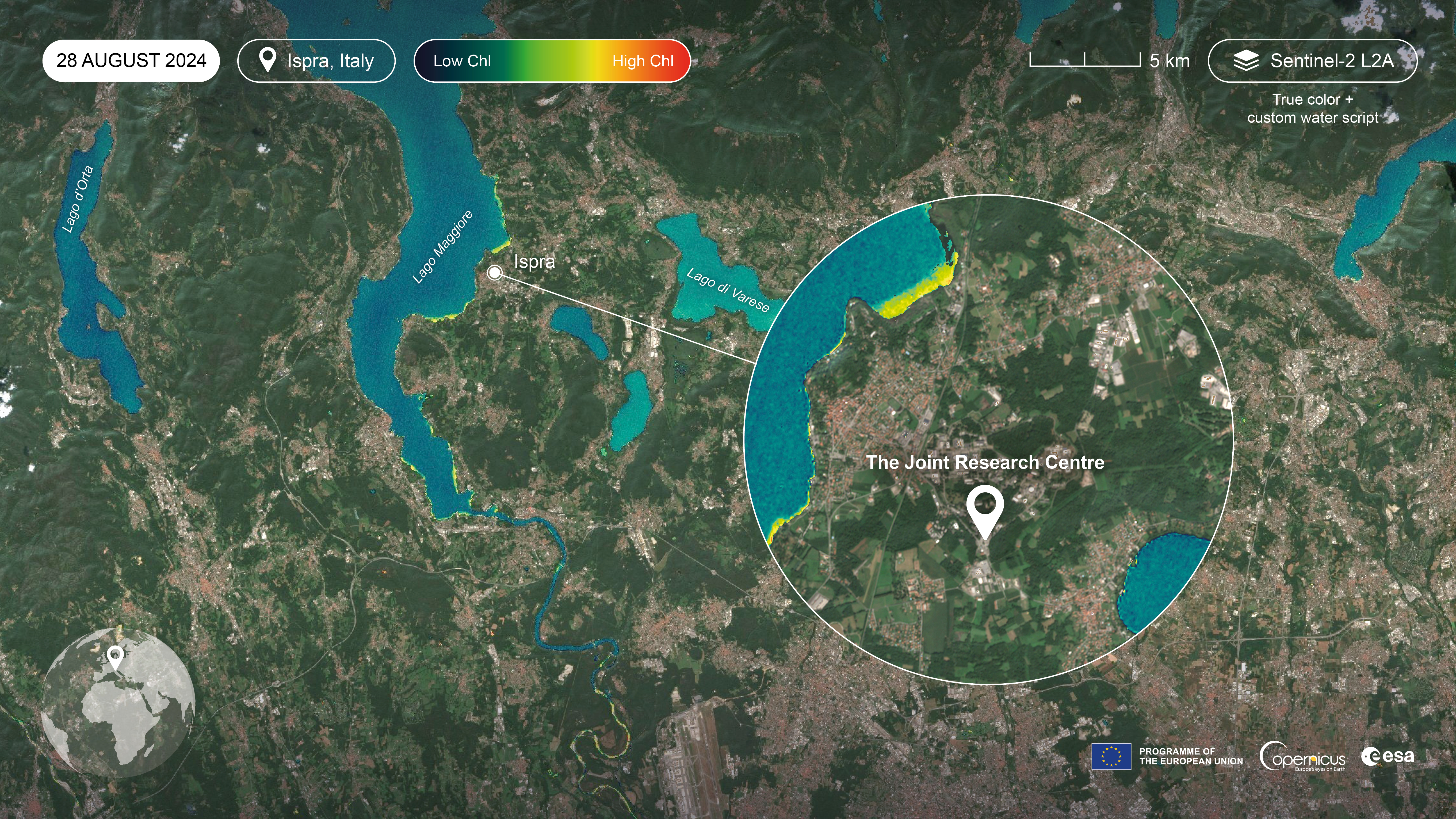 This Sentinel satellite image shows a combination of Sentinel-2 data and a custom script to visualize the chlorophyll and sediment conditions of water bodies in the region of Lombardy in northern Italy with the town of Ispra, close to the eastern shore of Lake Maggiore.