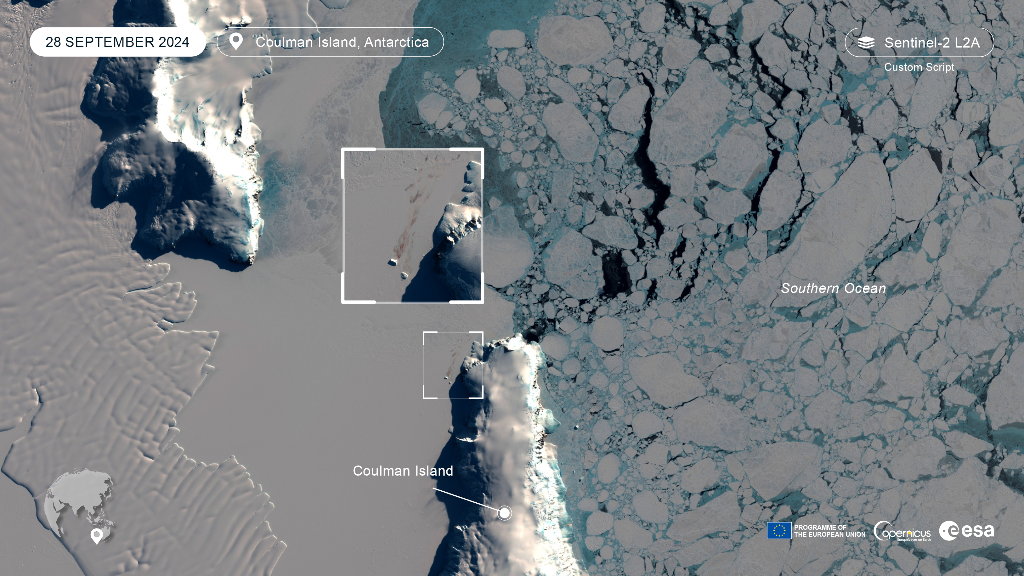 This site is an ice shelf between Coulman Island on the east and David Glacier (which is visible on this broad Copernicus Browser view). Every year, during the Antarctic spring, Emperor penguins group here to raise their chicks. As all of Antarctica, this area is also affected by changing ice conditions due to climate change.