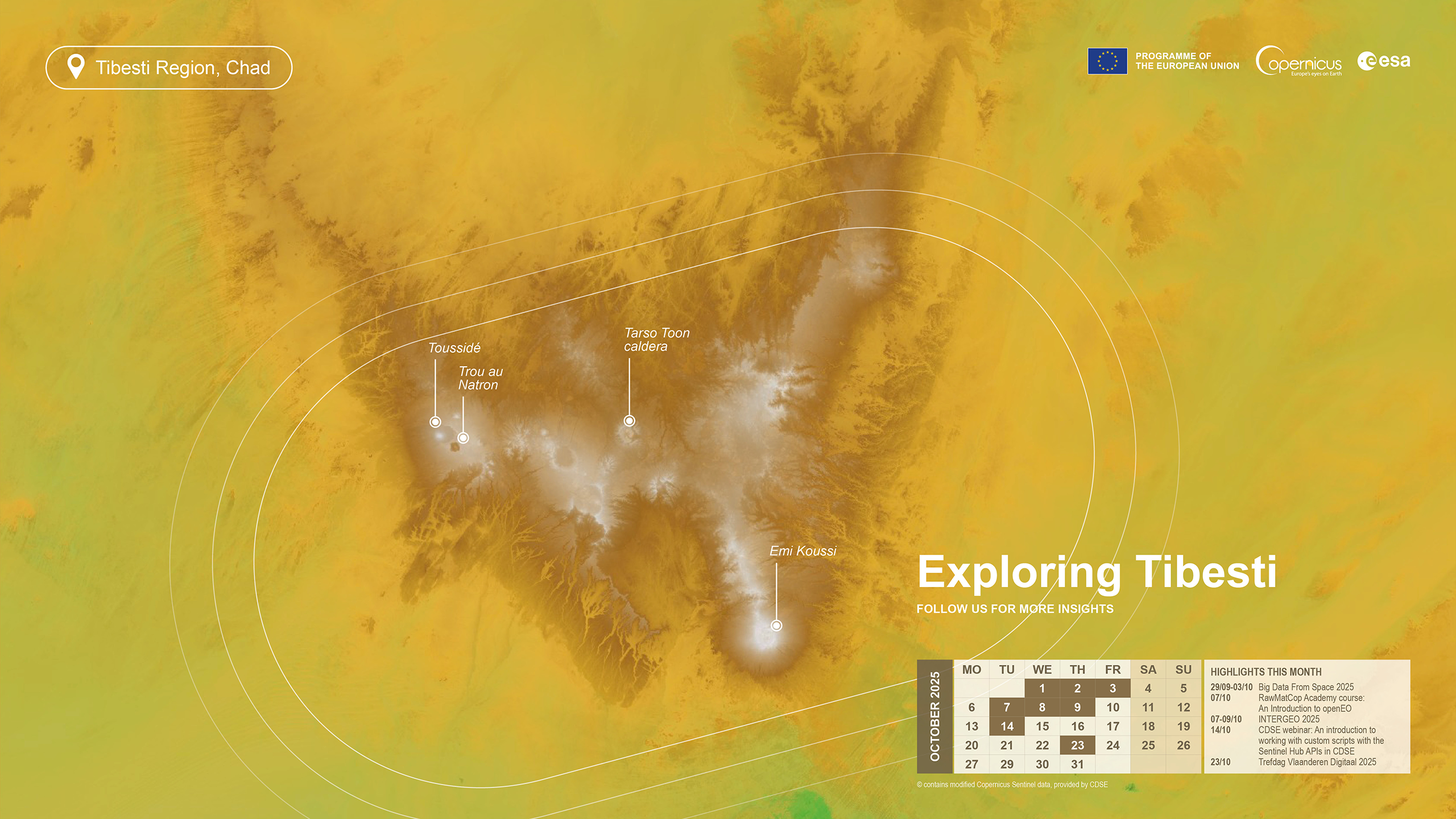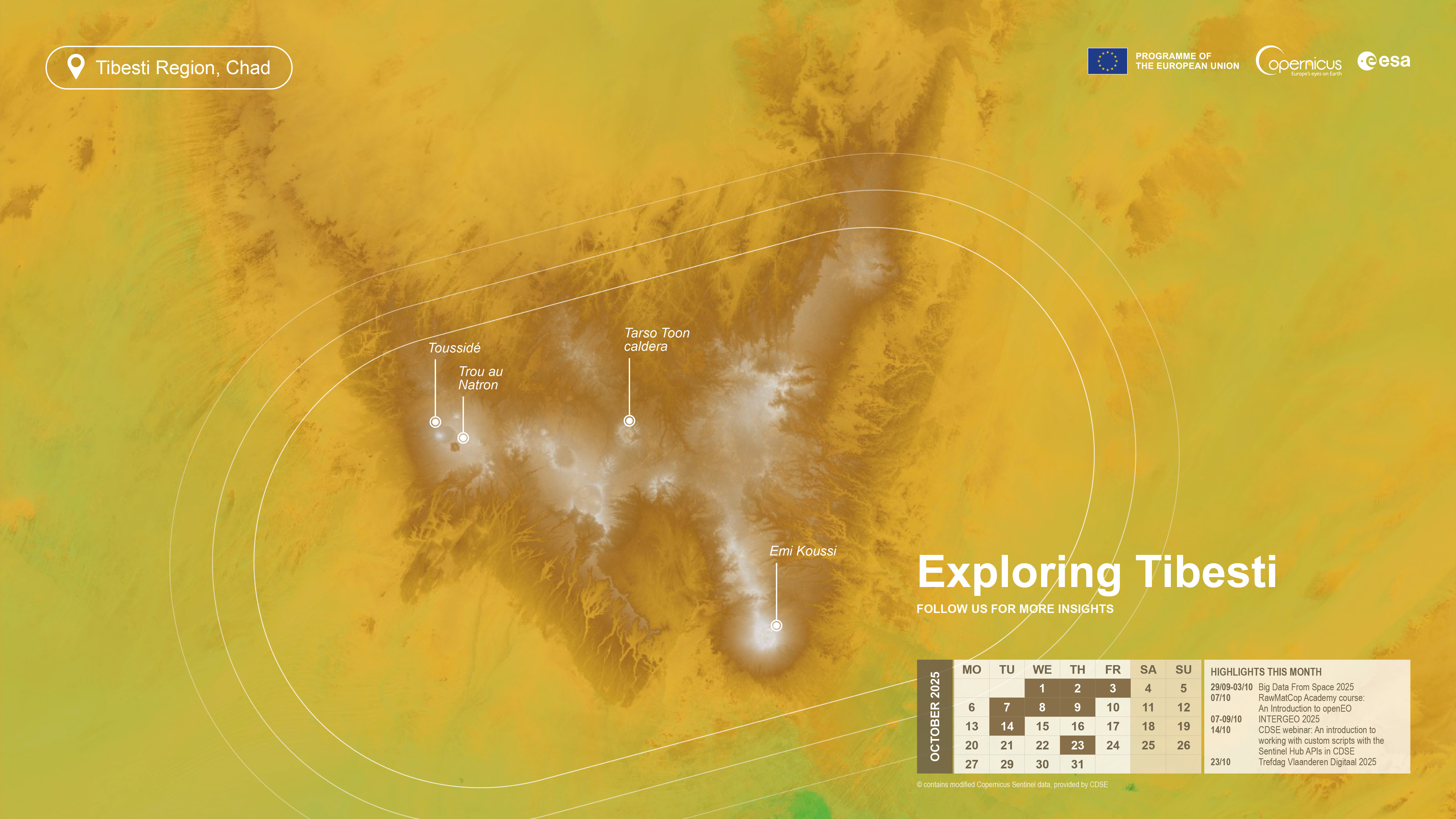The main volcanic features of the Tibesti Range can be identified: the tallest peak with the large circular caldera is Emi Koussi, the tallest mountain of the Sahara Desert. This shield volcano has an elevation of 3,450 meters and has a round caldera of about 12 km in diameter. The other large crater is the Tarso Toon caldera, and the depression with the sharp boundary on the west is Trou au Natron, just south of Toussidé. Although Tibesti’s volcanoes are not known to be active in historic times, the arid climate and the lack of vegetation have given the landscape some truly spectacular features, such as rock forests and rock arches - definitely worth exploring with Sentinel-1 and Sentinel-2.