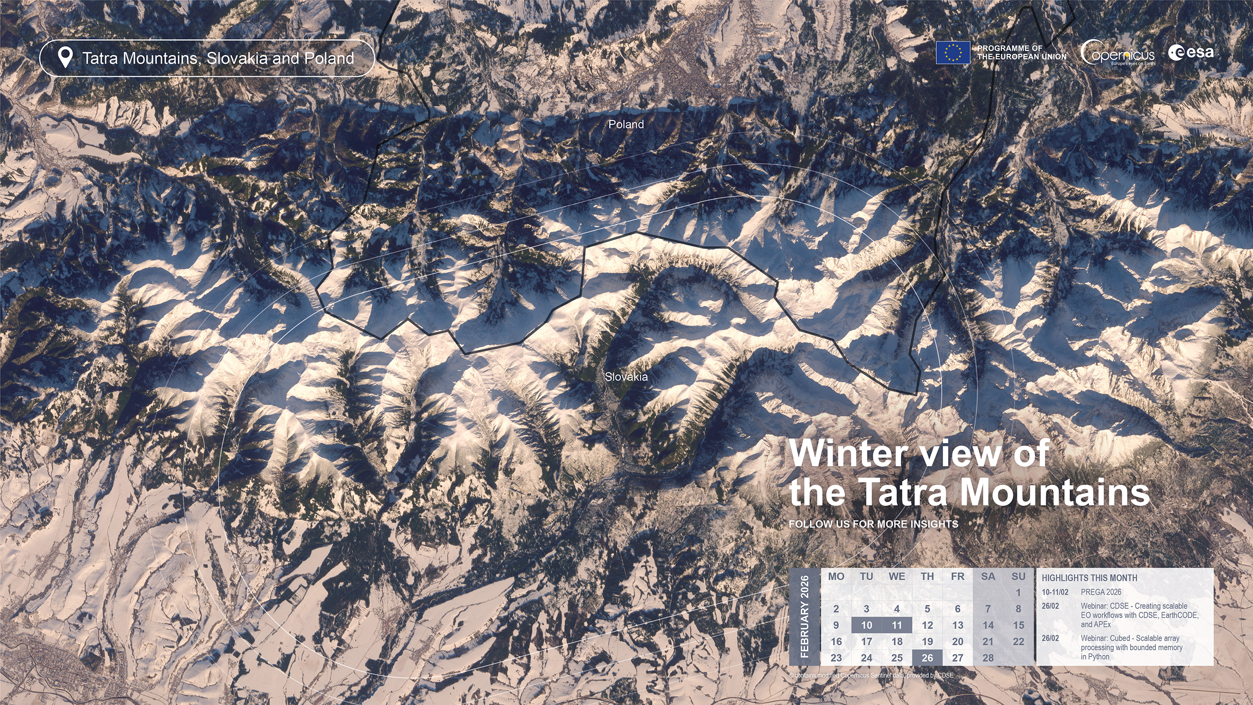 This image is a Tonemapped Natural Color visualisation of the Level-1 Sentinel-2 image from 18 January 2026. Tonemapping slightly reassigns bright values in the upper part of the spectrum, avoiding overexposure while slightly correcting dark areas. In combination with the low angle of the winter sun and the uncompensated effects of topography, shadows and highlights mark slopes facing away from or towards the sun. This algorithm also conserves the vivid green of coniferous forests and dwarf pine shrublands, showcasing the range’s rich diversity. Download the February 2026 desktop background to decorate your screens this month and explore the mountain ranges yourself in detail via Copernicus browser.